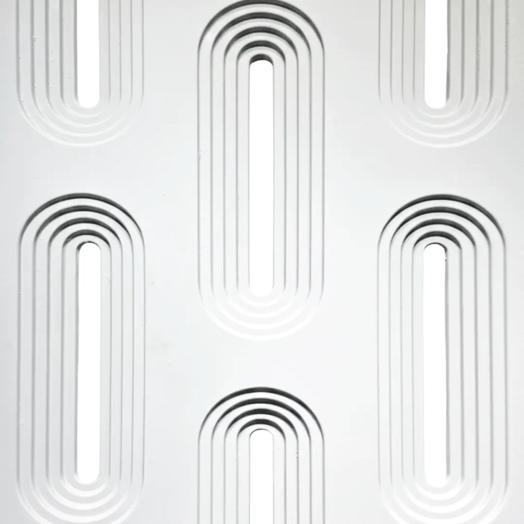 بديل الحجر PU-N-1017 بلون OFF WHITE يتميز بتصميم هندسي عصري بنقوش منحنية متكررة تضيف لمسة فنية راقية للجدار. التفاصيل البارزة ثلاثية الأبعاد تعطي إحساساً بالحركة والعمق، مما يجعل الجدار نقطة جذب أساسية داخل المساحة ويبرز جمال الإضاءة الجدارية بشكل واضح.